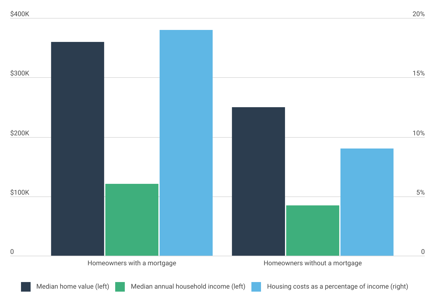 Homeowners with a mortgage report a median home value of $360,000, significantly higher than the $250,000 median value for homes owned outright. Similarly, households with a mortgage have a median annual income of $121,000, compared to just over $85,000 for those without a mortgage. Consequently, median housing costs as a percentage of income—including mortgage payments, insurance, utilities, and other home-related expenses—amount to 19% for homeowners with a mortgage, compared to just 9% for their mortgage-free counterparts.