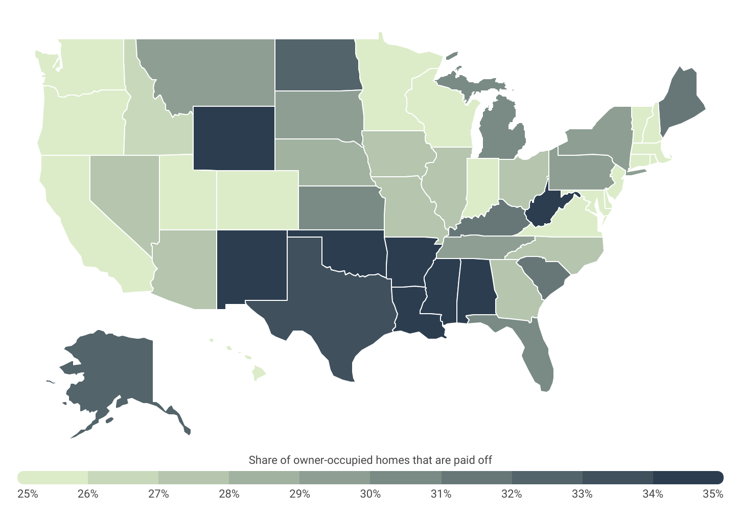 Mortgage payoff rates vary substantially across the country. While at the national level, the share of homeowners under age 65 who have paid off their homes is 27.7%, not all areas have equal rates of free-and-clear homeownership. Being mortgage-free is strongly negatively correlated with both household income and home value, so certain states in the South like West Virginia (41.1%), Mississippi (40.8%), and Louisiana (36.2%), all have shares of owner-occupied homes that are paid off above 35%.