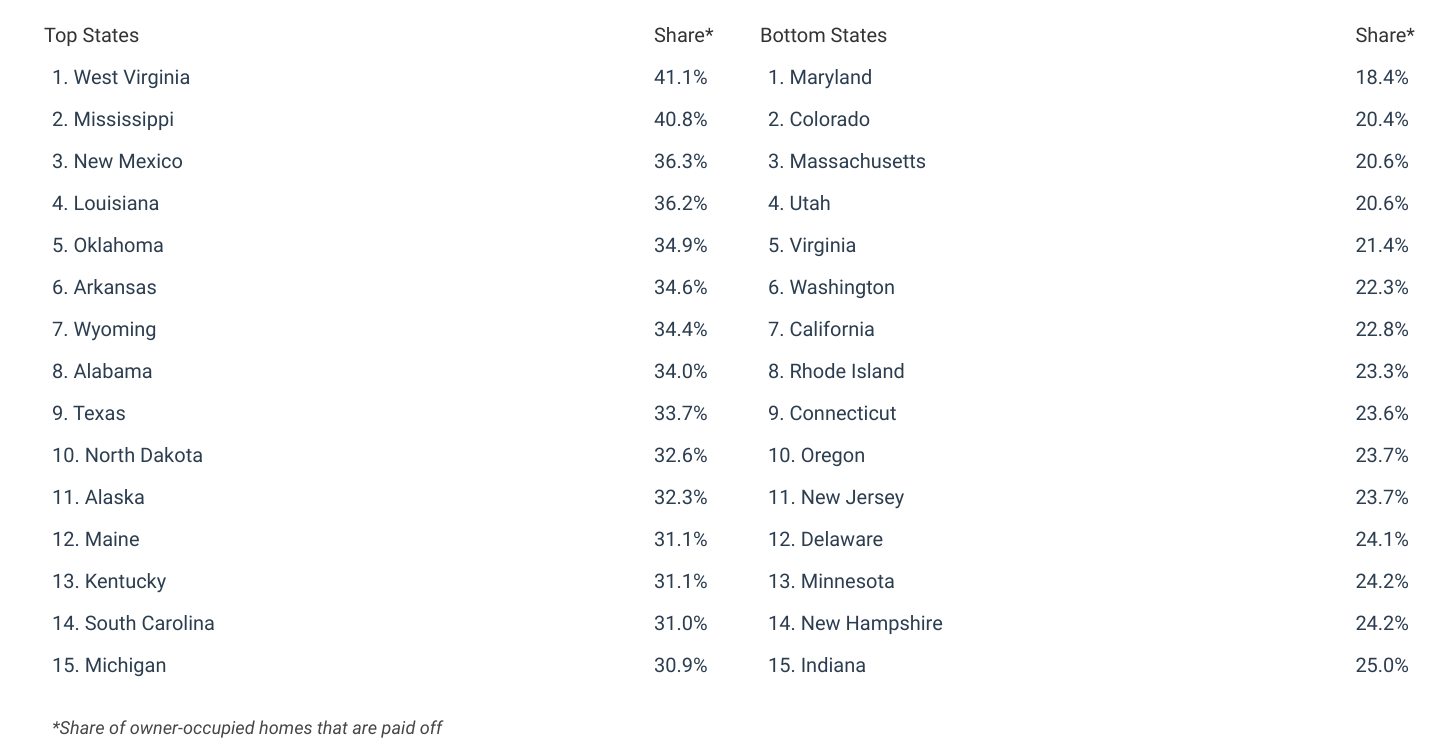 States With the Most Residents Who Have Paid off Their Homes